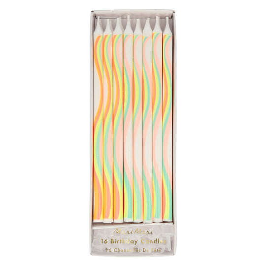 In het doosjes zitten 16 lange, witte kaarsjes met een golvende pastel regenboog print.